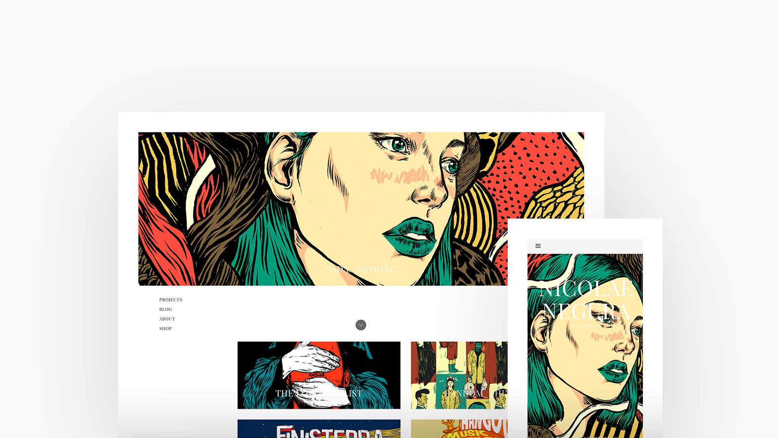 Nicolae Negura is a Romanian Illustrator that decided to make Lisbon his home and source of inspiration. His work is a combination of strong and garish colors and a rough ink trace that resembles vintage comics. Nicolae is using Jute, with a featured thumbnails homepage and lightbox thumbnails project layout.
