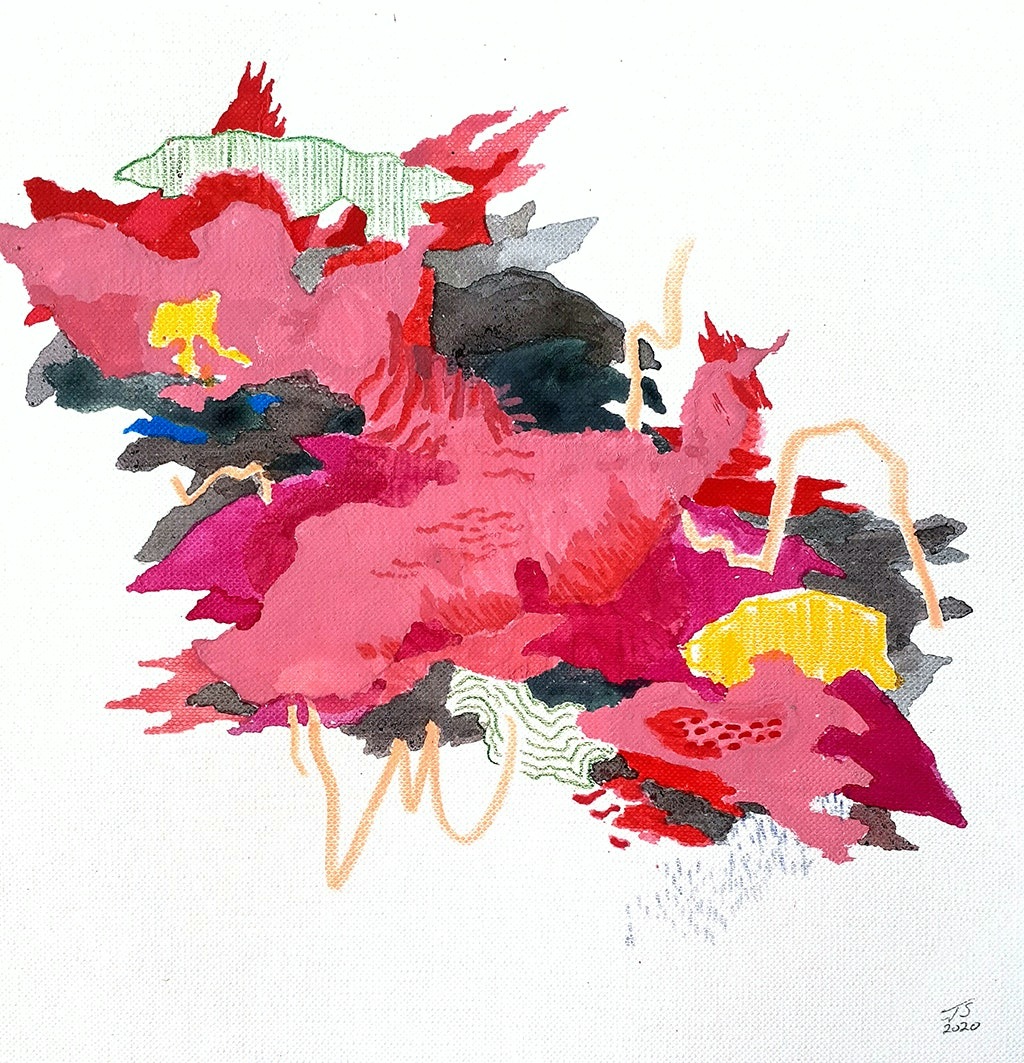 Justin Southey: Haha, funny that you should mention it. Aside from being a sucker for blue and pink in general, they were some of a few acrylic inks that I picked up at an art store just before lockdown was announced and we left for the farm. They dry pretty fast, so were my go-to base medium for my paper works, considering my time constraints. It's quite funny how such a flippant choice has ended up influencing so many of my works.