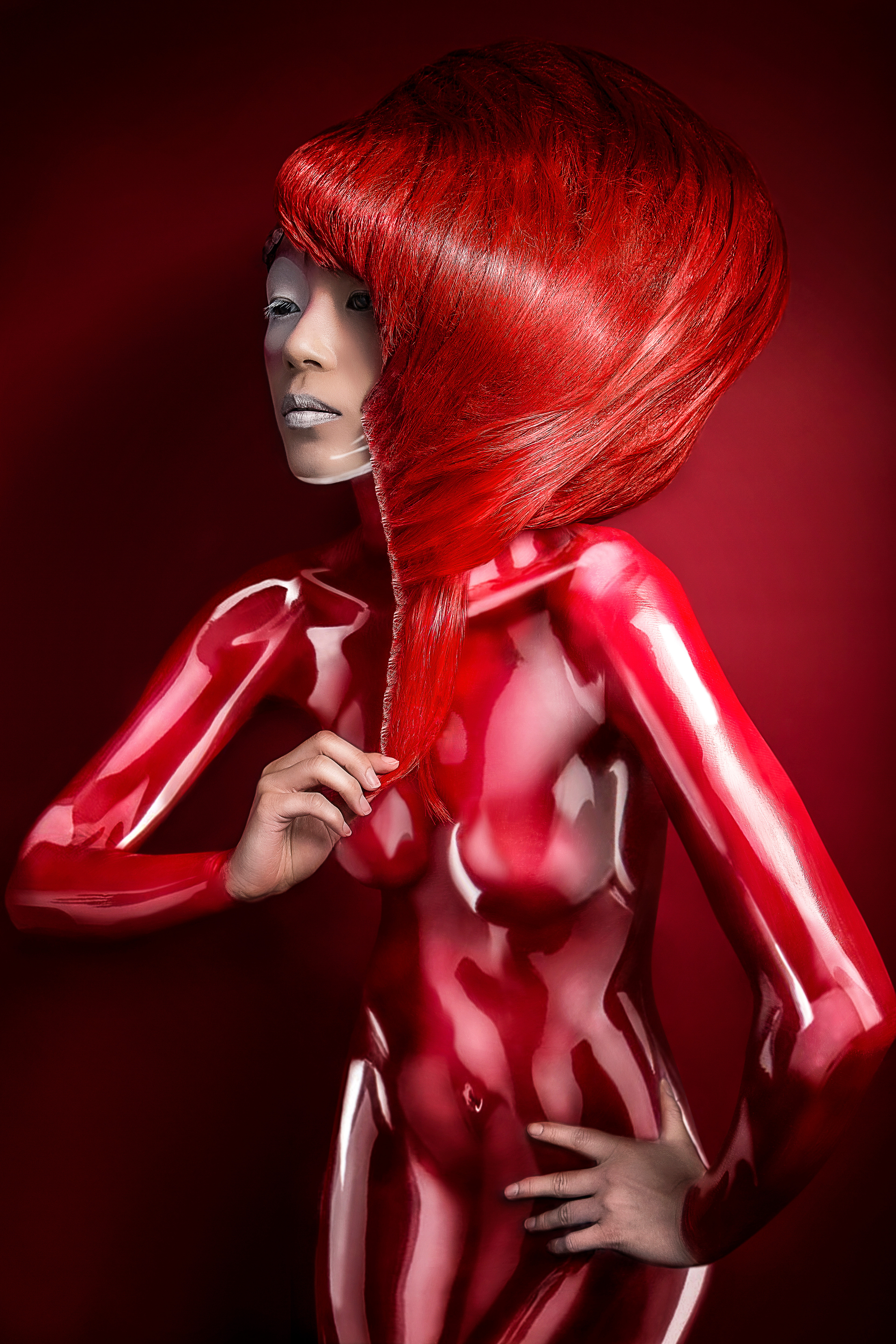 Distinctive, strong, vivid imagery: JARRED Photography uses a combination of photography and post to achieve his particular style. His talent has won him numerous industry awards in fashion, advertising and editorial portraiture; awarded BIPP Commercial Photographer of the year 2016 & BIPP Scottish Commercial Photographer 2014 & 2015.Techno Colour: RED is the first in an award-winning series of ongoing colour themed Photography shoots in collaboration with international hair stylist Jason Hall. Photography & Post: Lee Høwell. Makeup Artist: Rachel Gallagher. Hair: Jason Hall. Models: Sophia Chan & Kei Sung.