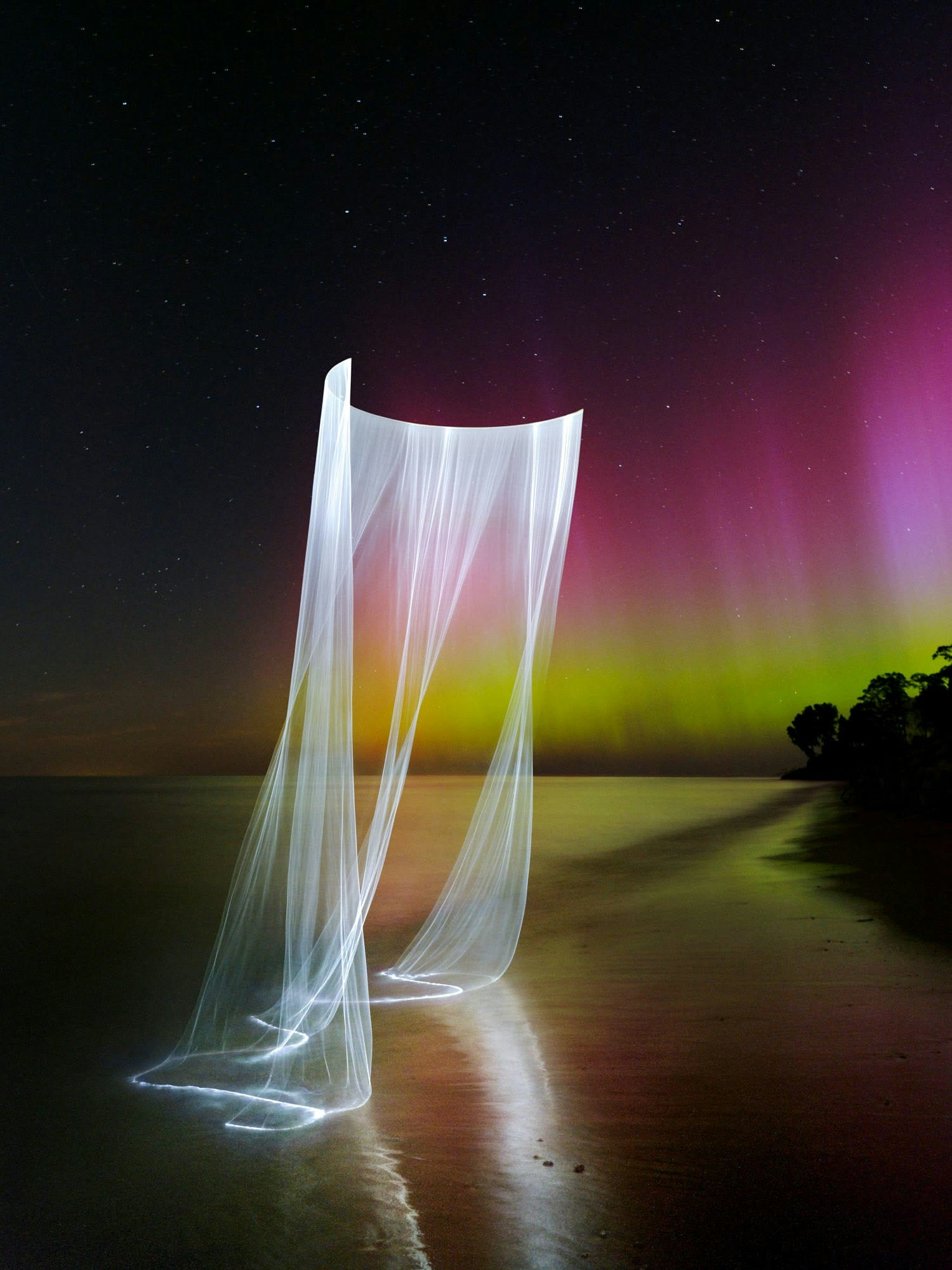 Ethereal, Luminous Curtains Cascade Over Lake Michigan in Reuben Wu’s Light Paintings