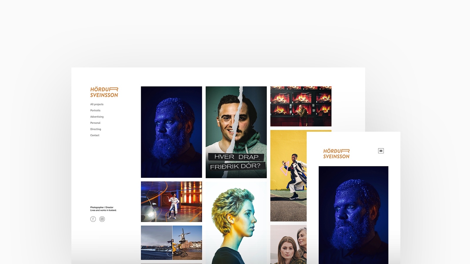 Reykjavík based Photographer and Director Hörður Sveinsson specialises in portrait, editorial and advertising photography and video. Hörður is using Canvas, with a thumbmails homepage and stacked project layout.