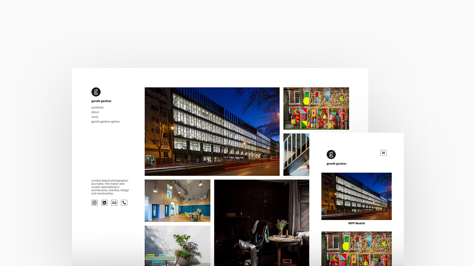 Gareth Gardner is an architectural photographer, filmmaker, journalist and curator based in London. Gareth is adept at examining the built environment and his portfolio is testament to this. Gareth is using Canvas, with a spotlight homepage and spotlight project layout.
