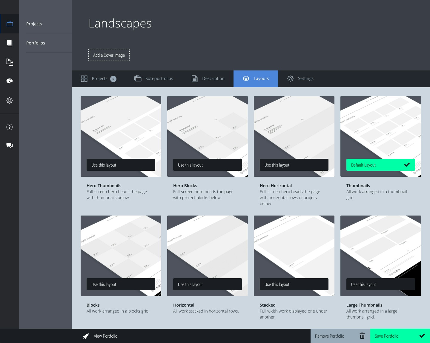 You can now set unique layouts for each or all of your portfolios, and - if you have them, sub-portfolios. You'll now find a new Layouts tab within your Portfolio and Sub-portfolio options, featuring unique layouts for displaying both portfolios and projects at the same time. The possibilities are almost endless, but in a nutshell you now have complete freedom in how you want your work to be grouped and displayed.