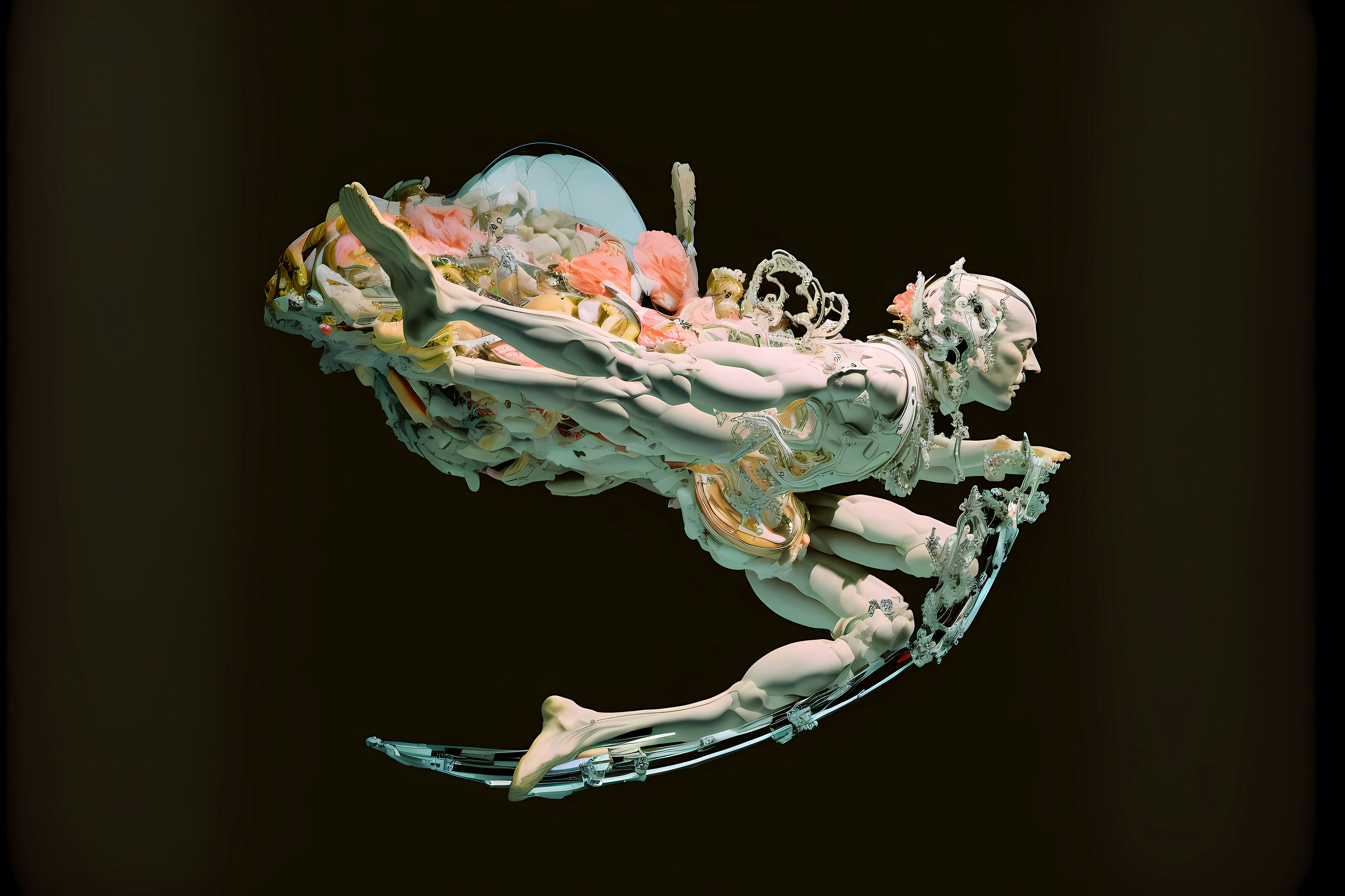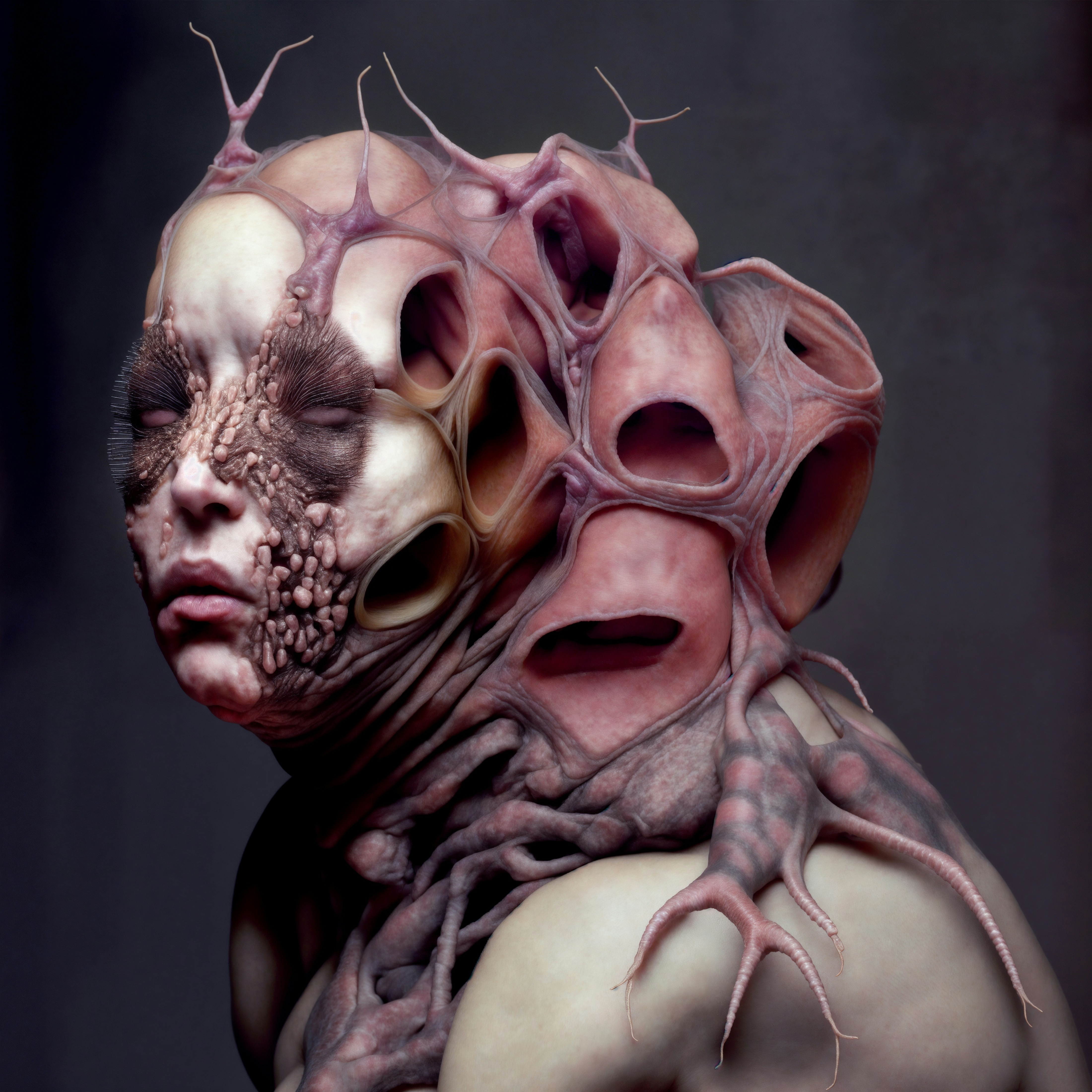 "Human-guided-AI-generated digital render exploring possible future post-human forms as a result of the convergence of genetic engineering and artificial intelligence. These studies aim to highlight questions about our species' future. Where does a path of ever-increasing technology lead us, and ultimately, what will it mean for the human condition?" —@_abhominal_art