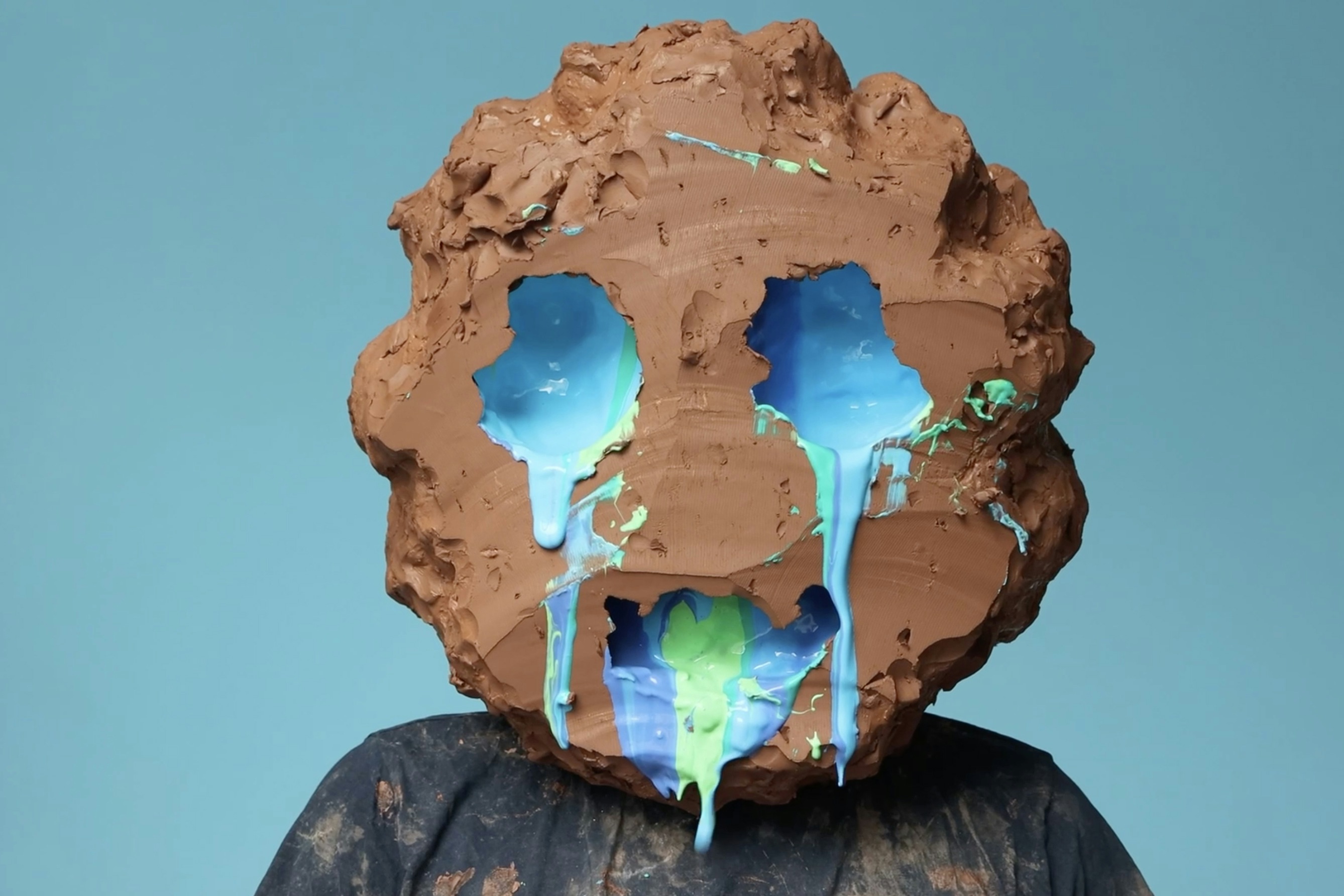 "A clay wire cuts through a mass of the formless clay head, slicing off carpaccio layers to reveal the layers below. With each new slice candy coloured paint oozes out, revealing eye and mouth-like orifices. Reminiscent of B movie horror films where limbs are cut open and blood pours out, here the glossy coloured liquid imbues this slapstick action with more ambiguity, and the performance is more deadpan. There is an abject quality to the interior of the clay head spewing forth, and blurring the boundary of the body that then spills out. The ASMR sounds of the puckering of the clay, and dripping of the paint, add to the sensory experience of the material narrative." —@WilliamCobbing