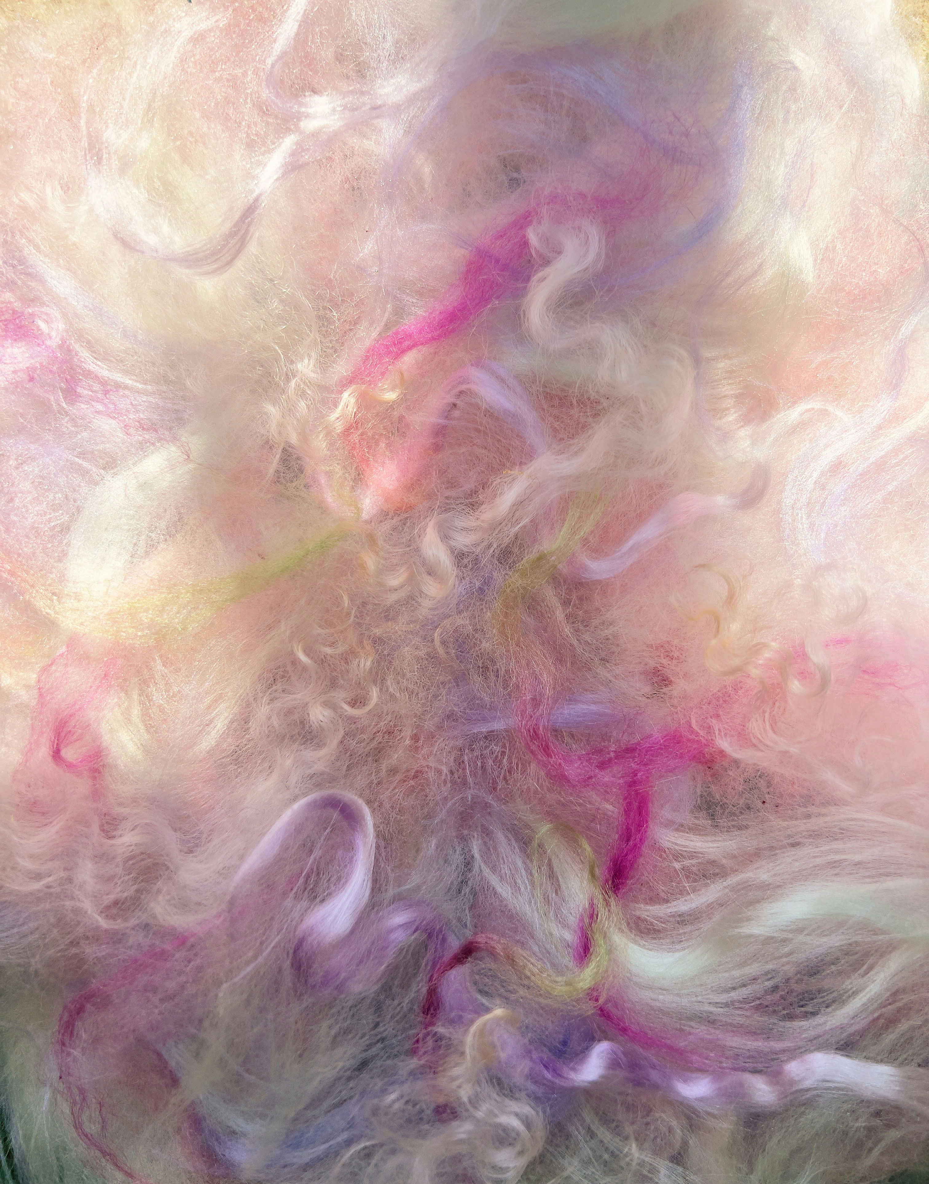 "Abstract artwork created from pure wool roving, merino curls and viscose fibres." —@in_cloudlands