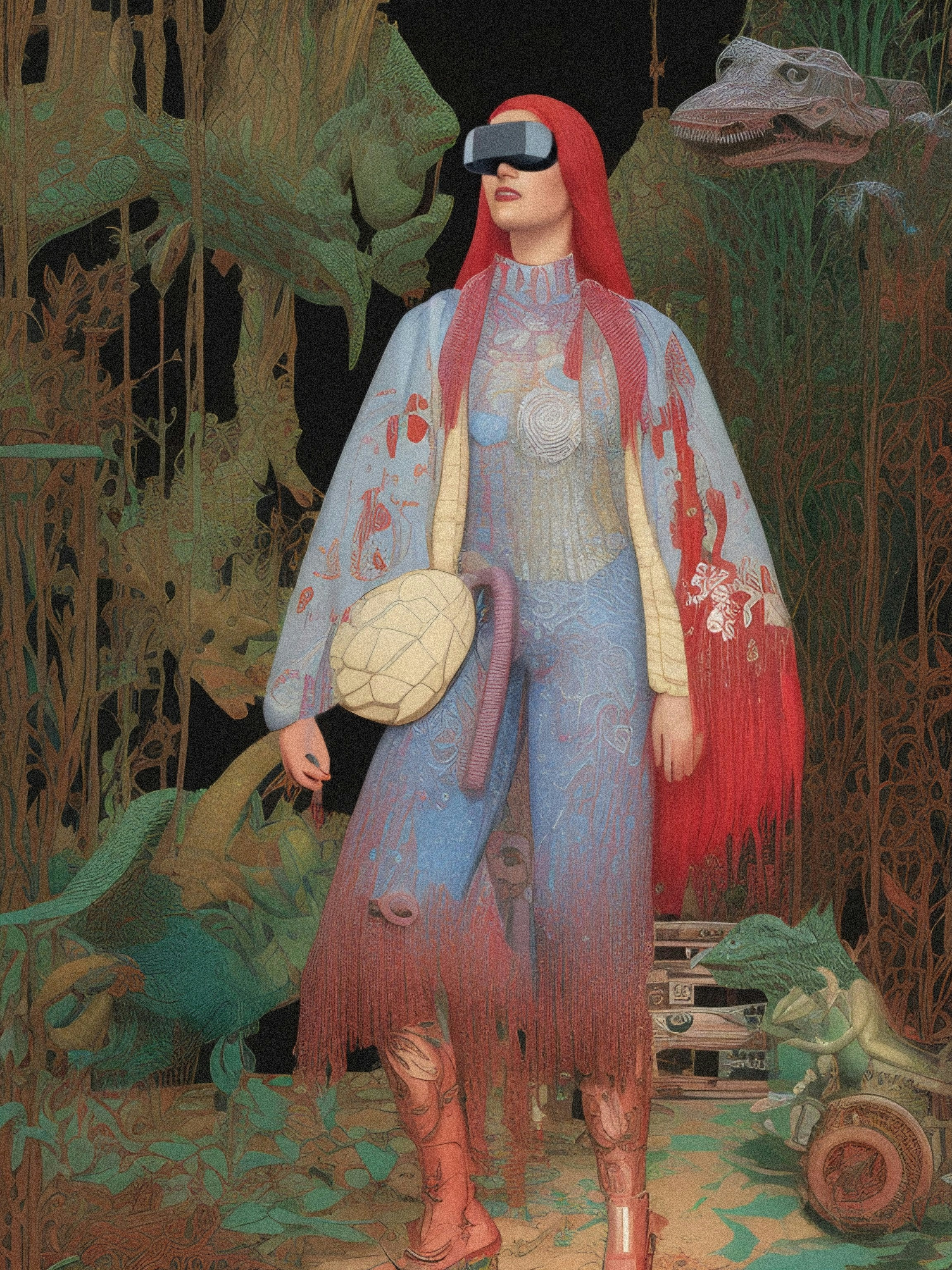 "What fairy tales does the heroine watch in her VR glasses? I know that she loves to travel through time and is friends with dinosaurs. She carves a woodcut for them while listening to the music from Lost Eden computer game." —@XenoCat_Art