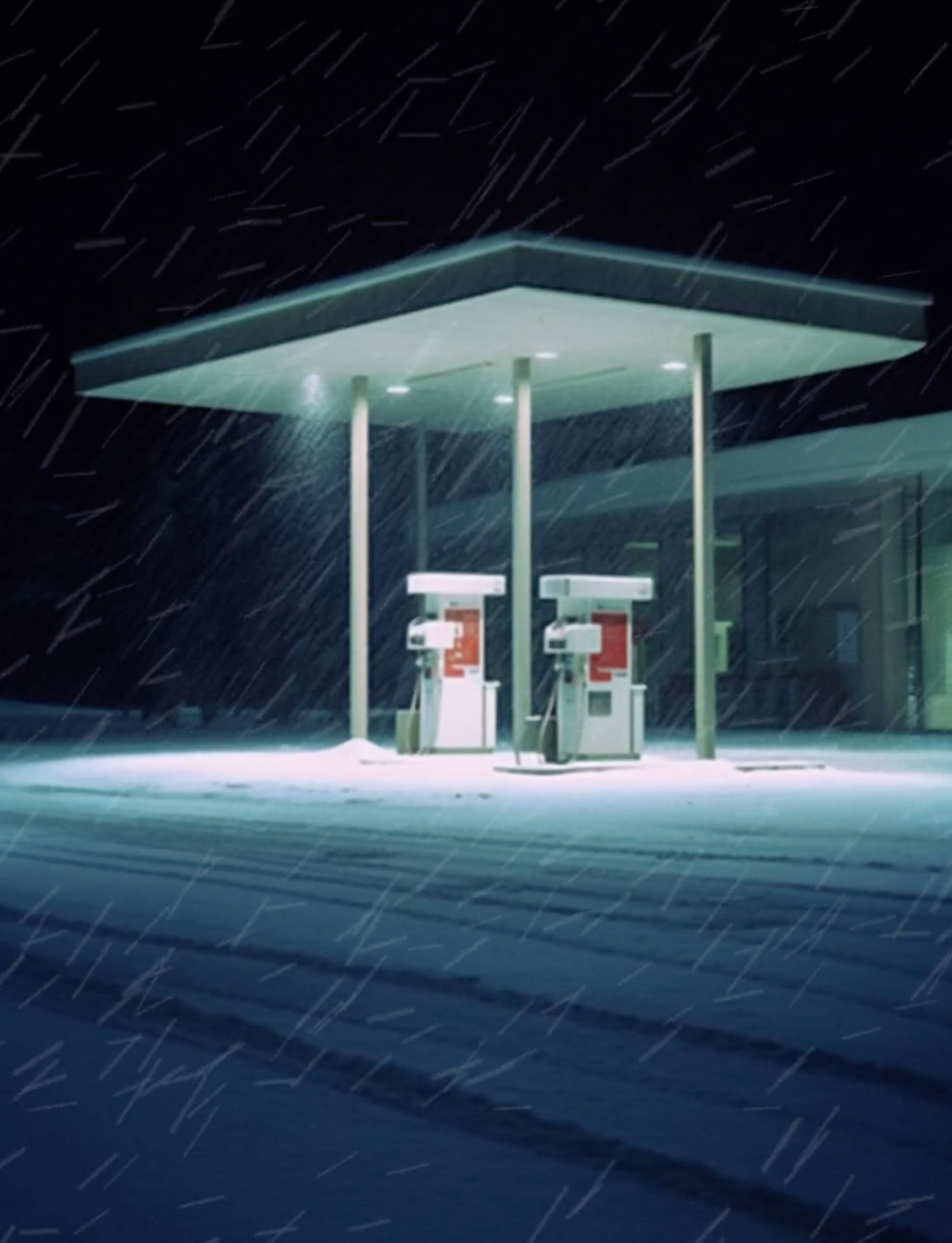 ‘A memory of the snow, beginning it's descent on a lonely gas station. A feeling of loneliness, as the cold consumes.’ — @delta_sauce