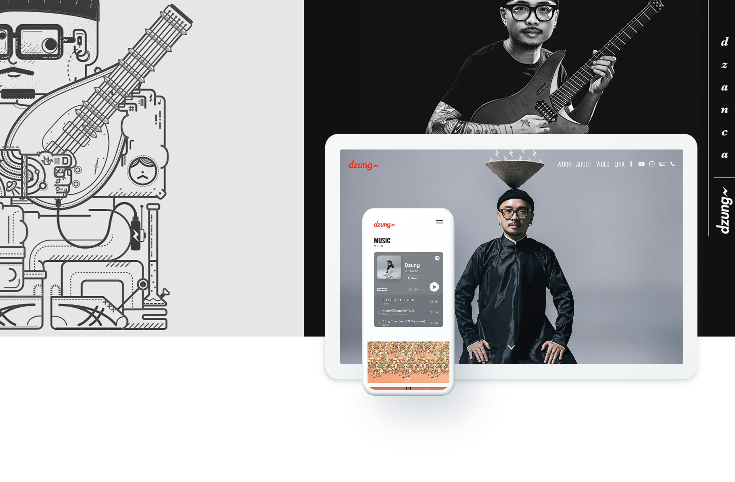 Fabrik user dzung proving to everybody that you can combine photography, artwork, outbound links to tons of places, Spotify embeds & video and still have a sleek and not overcomplicated site — see it for yourself
